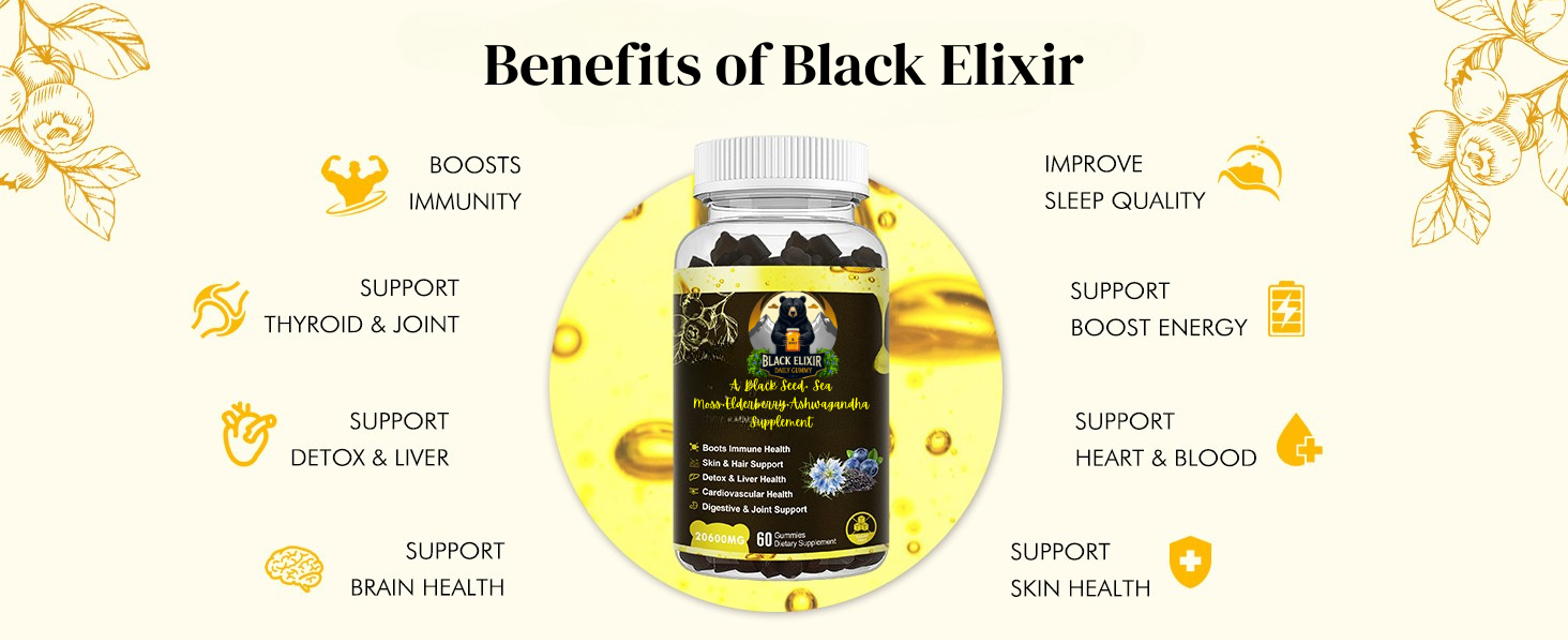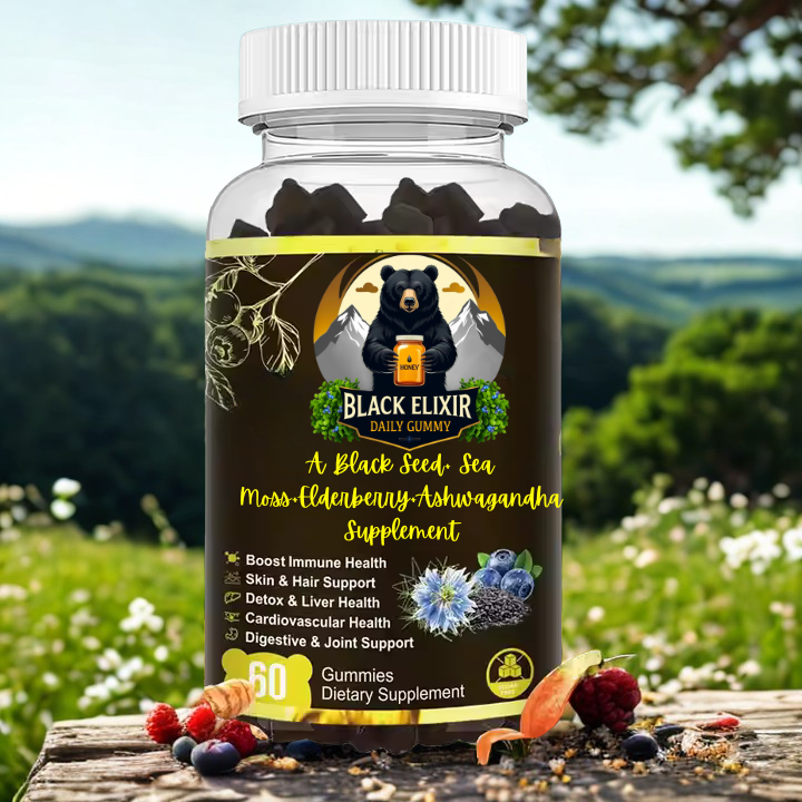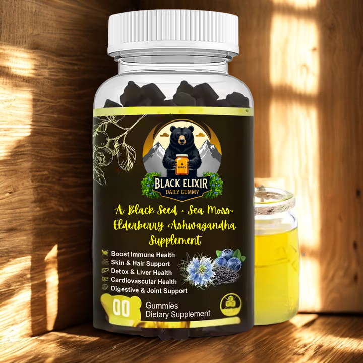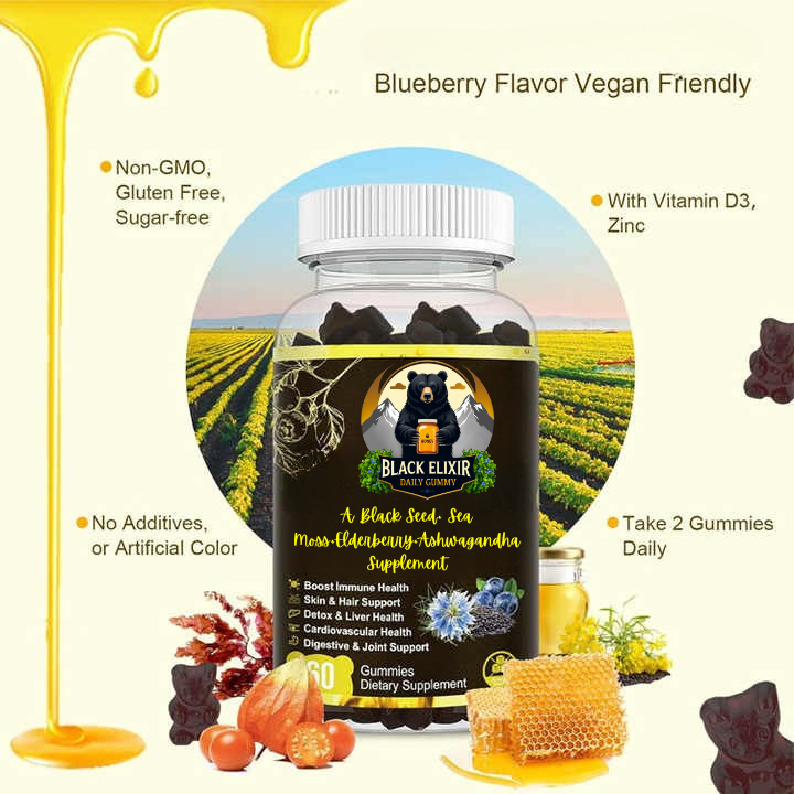 A Delicious Fusion of Ancient Wisdom and Modern Nutrition Unlock the holistic benefits of ancient wellness with Black Elixir Daily gummy , a vegan-friendly Sea Moss & Black Seed Oil Gummy, A blend of the best of nature and nutrition into a tasty, vegan-friendly chew that supports your whole-body health—without the pills, designed to support your Joint's overall health and vitality. These delicious blueberry-flavored gummies combine 12 ingredients—including cold-pressed raw honey, black elderberry black cumin seed oil, wildcrafted Irish sea moss, ashwagandha, turmeric, ebladderwrack, burdock root, beetroot, and immune-boosting Vitamins C, D3 & Zinc. Together, they deliver serious support for your immunity, energy, digestion, skin, hair, and focus—all in one easy bite.. Additionally, the formula's black elderberry and honey support digestive comfort, especially for those with poor digestion, by nourishing intestinal muscles and promoting gut health. These gummies are formulated to be PURE, POTENT, and EFFECTIVE—without the bitterness of traditional black seed oil. Just one tasty, elderberry-flavored gummy a day is all you need to stay balanced, energized, and resilient—supporting joints, skin, hair, and overall wellness naturally and holistically.