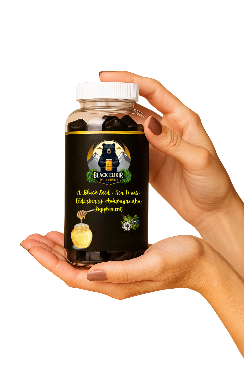 Answer 2: Black Elixir Daily Chews are crafted to support your full-body wellness—naturally. Each delicious blueberry gummy delivers 2000 mg of potent, plant-based nutrients including black seed oil, sea moss, elderberry, ashwagandha, and raw honey.